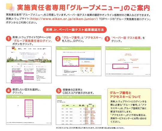 英検Jr.ウェブサイト(http://www.eiken.or.jp/eiken-junior/)の「グループ実施責任者ログイン」ボタンよりご利用ください。