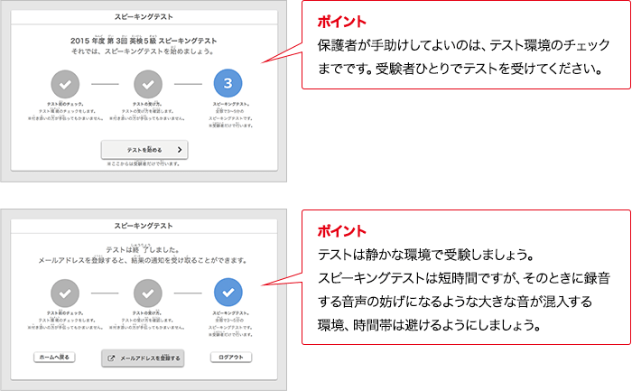 パソコン、マイクなどテストに使う機器やソフトのバージョンの確認、音量の調整などを行ってください。本サイトでも事前に確認をすることができます。必要に応じて保護者が手伝ってもかまいません。