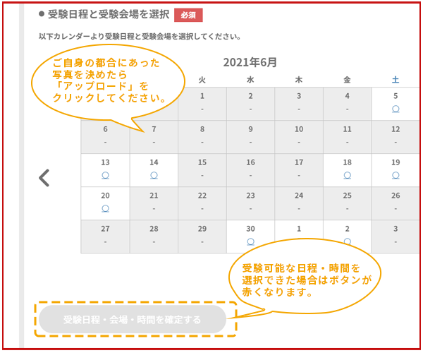 表示された試験会場のうち、空席がある会場、試験時間を選択し、「受験日程・会場・時間を確定する」ボタンを押します。